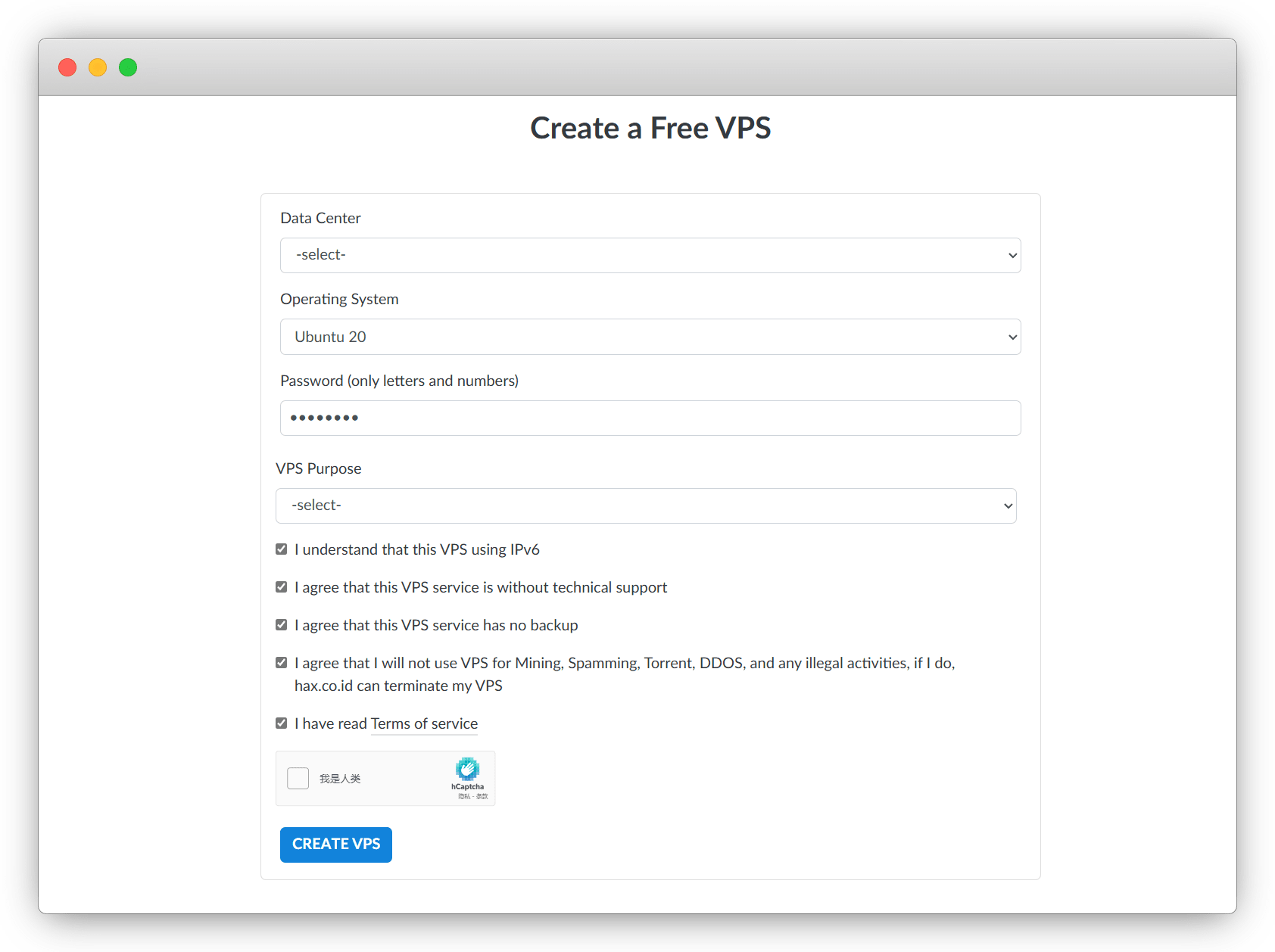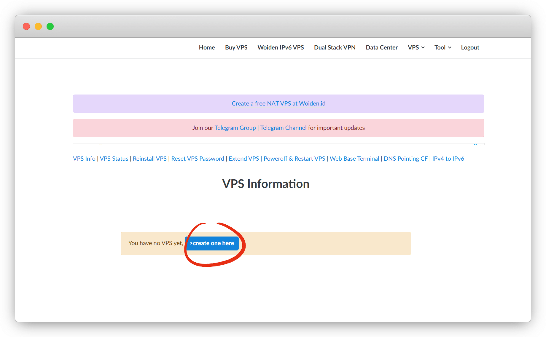 点击 Create one here ,或者右上角 VPS - creae VPS