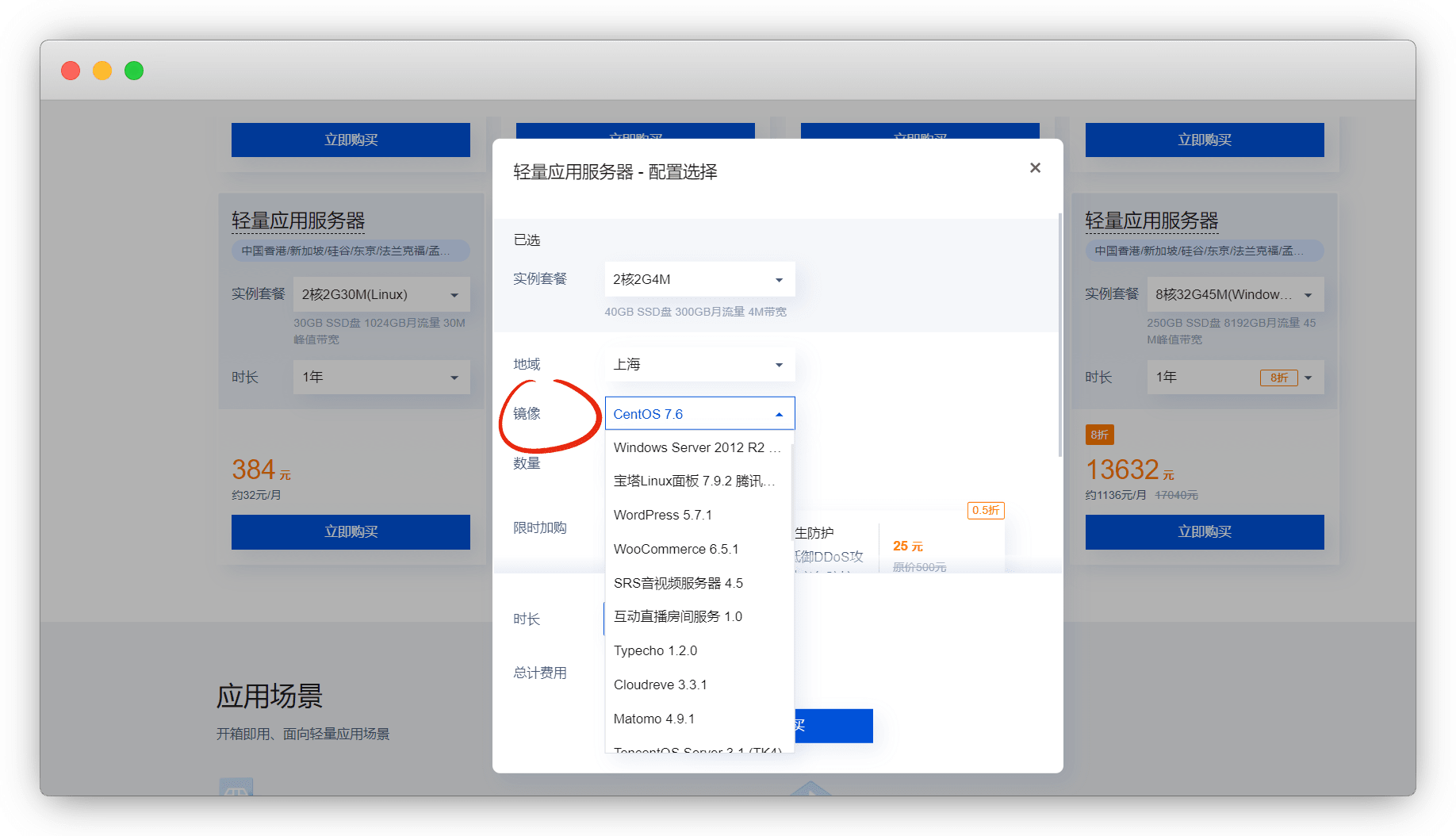 这里地域选离自己近的,镜像我使用 CentOS 7.6 ,选好后,支付订单即可!