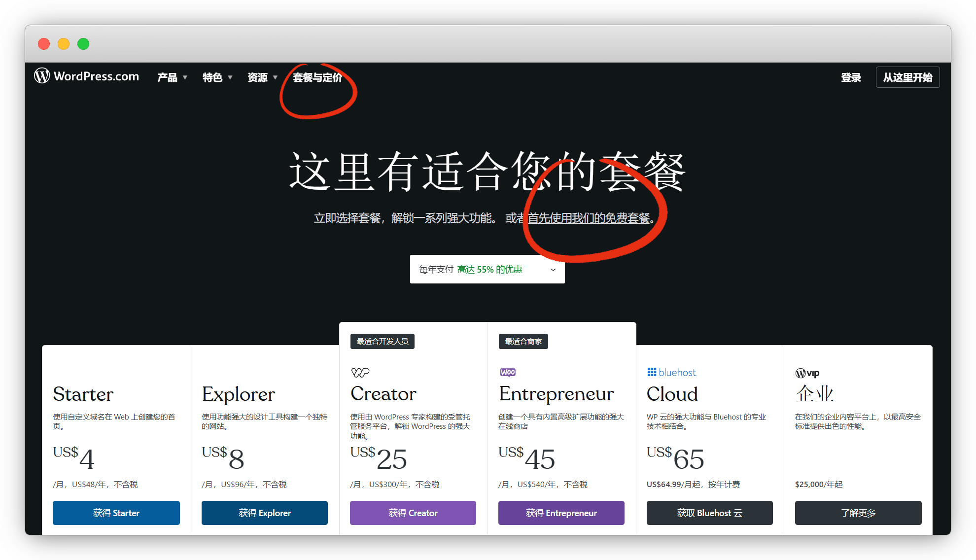 点击 套餐与定价,首先使用我们的免费套餐
