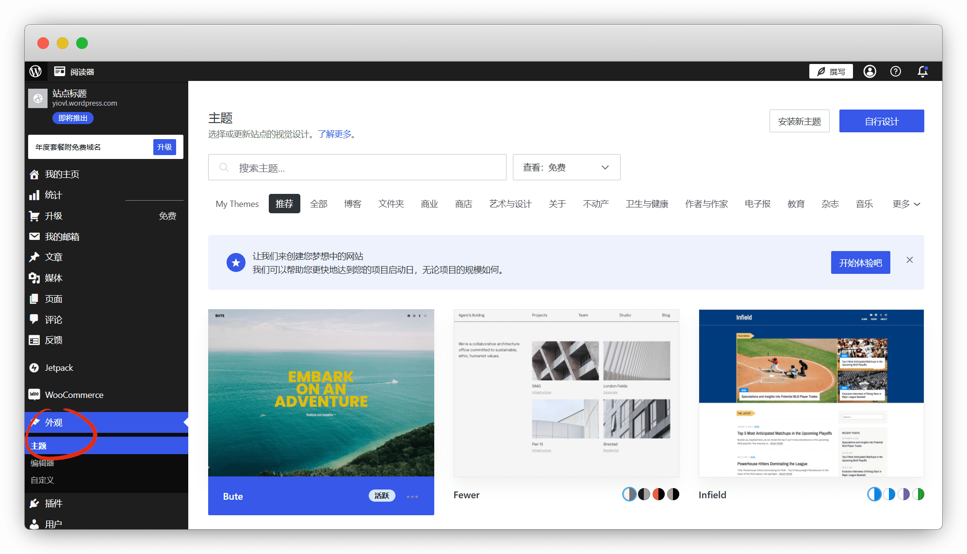 点击 外观 - 主题,选择免费的即可